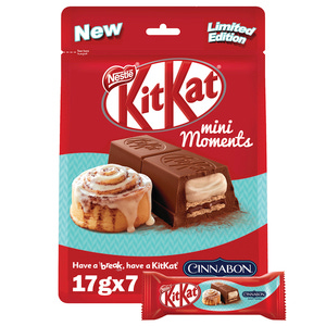 I merely appropriate mall food court culture these days because, as an inhabitant of a large city, the location of any chain located in the closest mall is the worst version of it available. Except for Cinnabon (and Auntie Anne's occasionally). A Cinnabon is still what my mind conjures when I think about a perfect Cinnamon roll, even though I've eaten (and baked) so many exceptional ones in my lifetime. So I can't pretend that this cross-promotional cash grab didn't catch my eye. I'm glad to see it is also available in the Kit Kat Mini Moment format instead of just the Kit Kat Chunky, avoiding the fatal flaw of too much chocolate distracting from the filling.